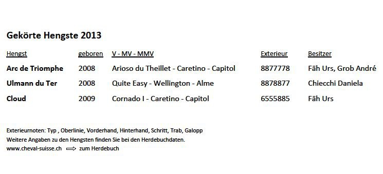 An der Exterieurbeurteilung der Hengste am 12.01.2013 in Bern wurden 6 Hengste vorgestellt. Drei Hengste erreichten Durchschnittsnoten von über 7 (Nanking de la Pierre, Ulmann du Ter und Arc de Triomphe). Ein Hengst erfüllte die Exterieuranforderung nicht. Ein Junghengst, der noch nicht voll entwickelt ist, erfüllte nur knapp (Er kann nochmals vorgestellt werden).