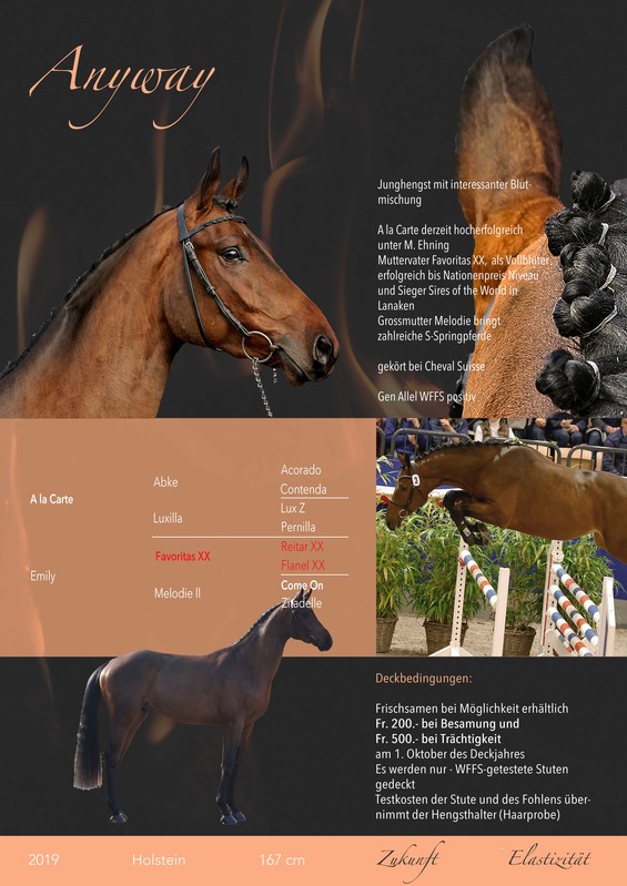 Conditions: CHF 200.- lors de la 1ère insémination + 500.- si jument portante au 1er octobre. Semence fraîche si disponibilité. Seules les juments testées WFFS seront saillies. Les frais d'analyses de la jument et du poulain (crins) sont pris en charge par le propriétaire de l'étalon. Anyway est un jeune étalon avec une génétique intéressante. A la Carte NRW a du succès sous la selle du cavalier international Markus Ehning. Le père de la mère Favoritas XX a signé des succès en prix des nations et vainqueur du Sires of the World à Lanaken. La grand-mère Melodie a produit de nombreux chevaux de niveau S.