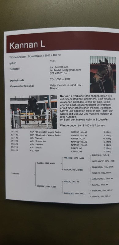 Disponible en semence congelée CHF 1000.- // Kannan L est un très sympathique et élégant cheval de saut moderne avec un bon caractère et près du sang. Il est actuellement monté par Ivo Spirig. À la fin 2017, Kannan L est 2ème au ranking de la Fédération Suisse des Sports (année de naissance 2012). WFFS: non-porteur