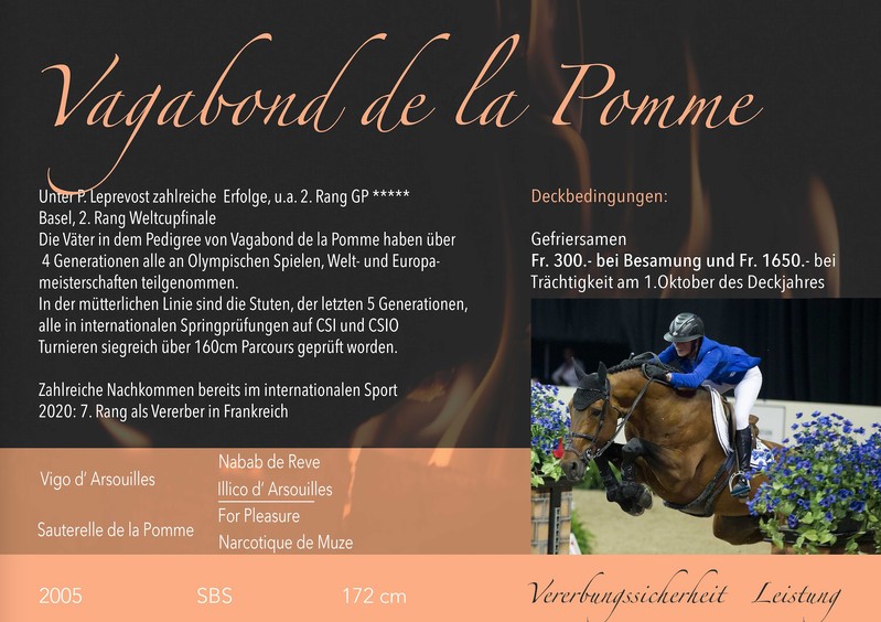 | Conditions: 300.- lors de la 1ère insémination + 1'650.- si jument portante au 1er octobre de l'année de saillie. Issu d'une lignée maternelle d'exception, Vagabond a montré durant toute sa carrière qu'il faisait partie des meilleurs chevaux de la planète. Doté d'une grande amplitude de galop, il démontre force, respect et facilité, qualités qu'il transmet à sa prometteuse production, qui brille en Grands Prix CSI5*! |