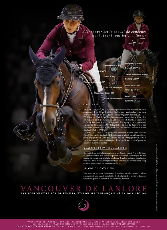 | Vancouver de Lanlore est un produit issu des meilleurs sauteurs européens. Il est fils de l'excellent Toulon par Heartbreaker et sa mère Hispania de Bacon est par le Tot de Semilly et Quille Girondine AA. Vancouver de Lanlore se distingue par sa belle régularité en compétition, son mental de guerrier, sa très belle amplitude de galop, sa bonne bouche, son sens de la barre, son intelligence hors du commun. Sa souplesse, son sang et son respect font de lui un étalon moderne. Distributeur Suisse : Avenches ISME Des classements exceptionnels en 2019 avec Pénélope Leprévost: 2ème GP 3* 155cm Offenburg, 2ème GP 3* 150cm de Vejer de la Frontera, 2ème GP 4* 155cm Vejer de la Frontera, 4ème GP 4* 155cm Gorla Minore 2ème Coupe des Nations CSIO 5*La Baule (4+0), 1er Coupe des Nations CSIO 5* St Gallen (0+0) 4ème GP CSIO 5* 160cm St Gallen, 2ème GP CSI 5* GCT 160cm Chantilly, Coupe des nations CSIO 5* Aachen (0+0) 2ème GP CSI 5* 160cm Dinard, CH-EU Rotterdam, CSIO 5* NC Final Barcelona, 13ème GP CHIO Rolex Grand Slam Geneva (1pt) Taxe de saillie : 1'000 euros + frais techniques et envoi à charge de l’éleveur, garantie poulain vivant // WFFS: non-porteur |