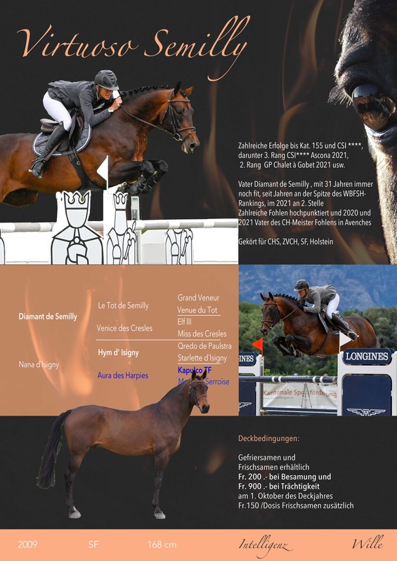 | disponible en semence congelée; CHF 1'100.00 (CHF 200.00 taxe de base à la première insémination + CHF 900.00 si jument portante au 01.10), semence fraîche sur demande et selon disponibilité suite au sport (supplément CHF 150.--), frais semence fraîche à la charge de l'acheteur // Virtuoso Semilly est un étalon chic, avec du charme, de l'intelligence, une bonne aptitude sous la selle, de l'élasticité et d'excellents moyens à l'obstacle. À 7 ans, Virtuoso Semilly a effectué des parcours 140 cm sans faute et s'est classé dans des épreuves internationales youngster. À 8 ans, il était l'un des meilleurs chevaux de son âge en Suisse et a effectué des parcours à 145-150 cm. Il a été approuvé à la fédération d'élevage CHEVAL SUISSE et les experts l'ont jugé avec la note maximale de 9 pour son excellent galop. Durant l'automne 2017, il a également été approuvé auprès de la FECH et a gagné la championnat suisse des Youngster à Avenches. Son père, Diamant de Semilly, élu comme meilleur étalon du monde en 2015 et 2016 dans le classement WBFSH, est une légende vivante. Champion du monde en 2002 à Jerez de la Frontera avec l'équipe nationale française, il a produit plus de 820 chevaux vainqueurs en internationaux, ainsi qu'une cinquantaine d'étalons approuvés. Sa mère Nana d'Isigny est une fille d'Hym d'Isigny, talentueux en Grand Prix sous la selle d'Eric Navet. En 3ème génération, la mère de Nana d'Isigny, Aura des Harpies, apporte le sang fançais trotteur (qui nous rappelera Halla, Jappeloup...). Virtuoso Semilly est un étalon sportif et très moderne - un grand espoir pour l'avenir. En 2018, classé en GP 155 cm EN 2019, nombreux classements GP (3ème Aarberg, 8ème Cheseaux et Chalet-à-Gobet, 3ème rang au championnat suisse Elite,...) En 2021, 3ème rang CSI****Ascona, 2ème rang GP Chalet-à-Gobet WFFS: non-porteur |