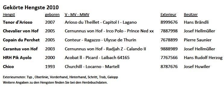 Il y avait 14 étalons annoncés pour l'appréciation de l'extérieur à Chevenez en vue d'une éventuelles approbation le 13.04.2010.